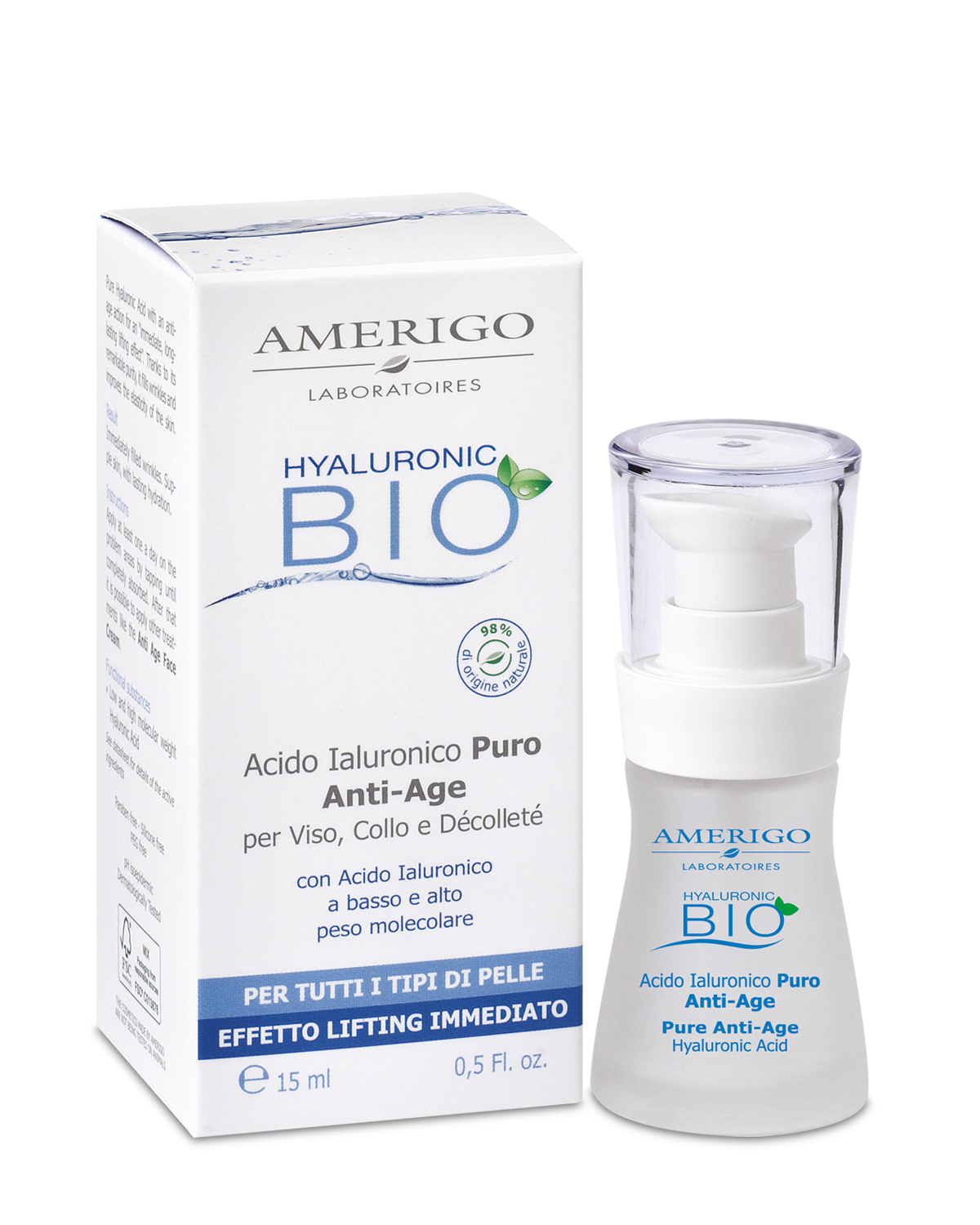 Negli ultimi anni la richiesta di mercato di prodotti cosmetici a base di ingredienti naturali e biologici è in continuo aumento. Per soddisfare questa richiesta, Amerigo Laboratoires ha creato la linea Hyaluronic BIO: trattamenti di bellezza multiattivi naturali per viso e corpo studiati per ristrutturare, idratare e combattere i segni del tempo. L’intera linea cosmetica NON CONTIENE parabeni, SLES, siliconi e oli minerali per garantire la massima tollerabilità cutanea.