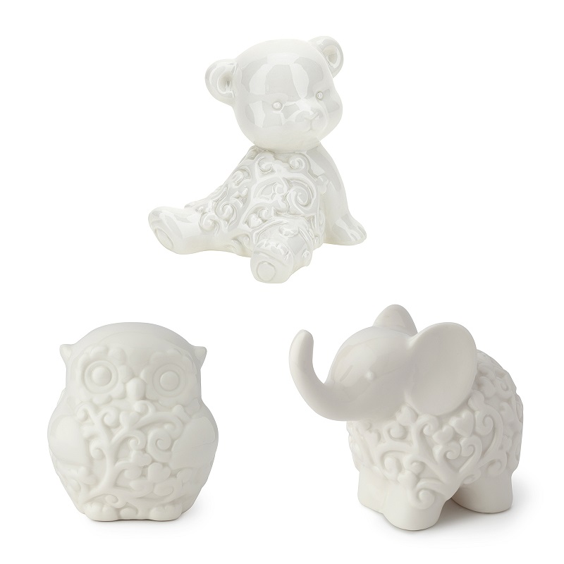 Orso, gufo ed elefante in porcellana bianca con decoro cuori.
