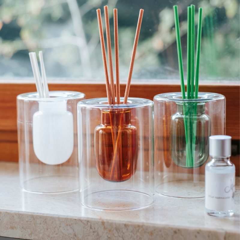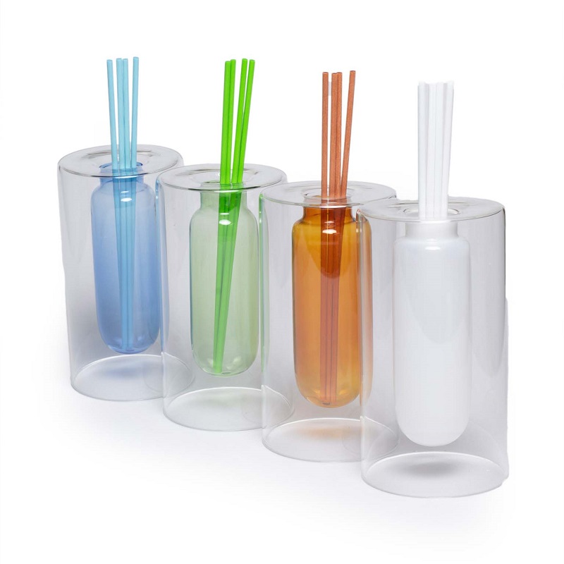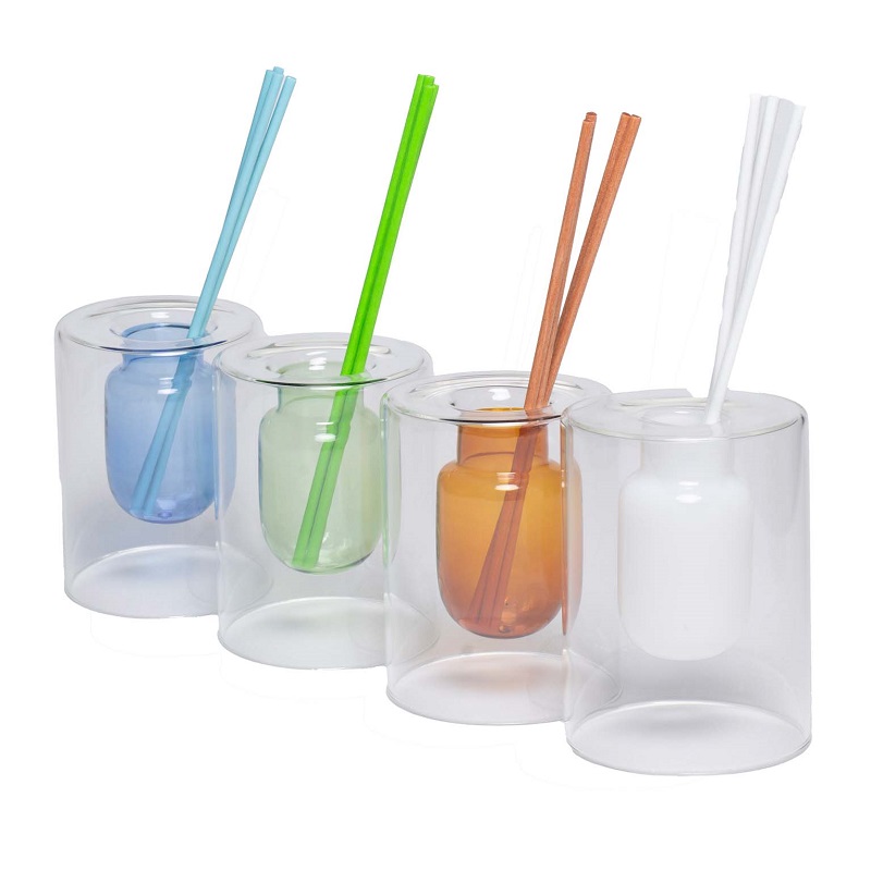 Profumatori per ambienti in vetro colorato (ambra, bianco, blu e verde). Bastoncini colorati e profumazione da 20 ml inclusi. Colori assortiti.