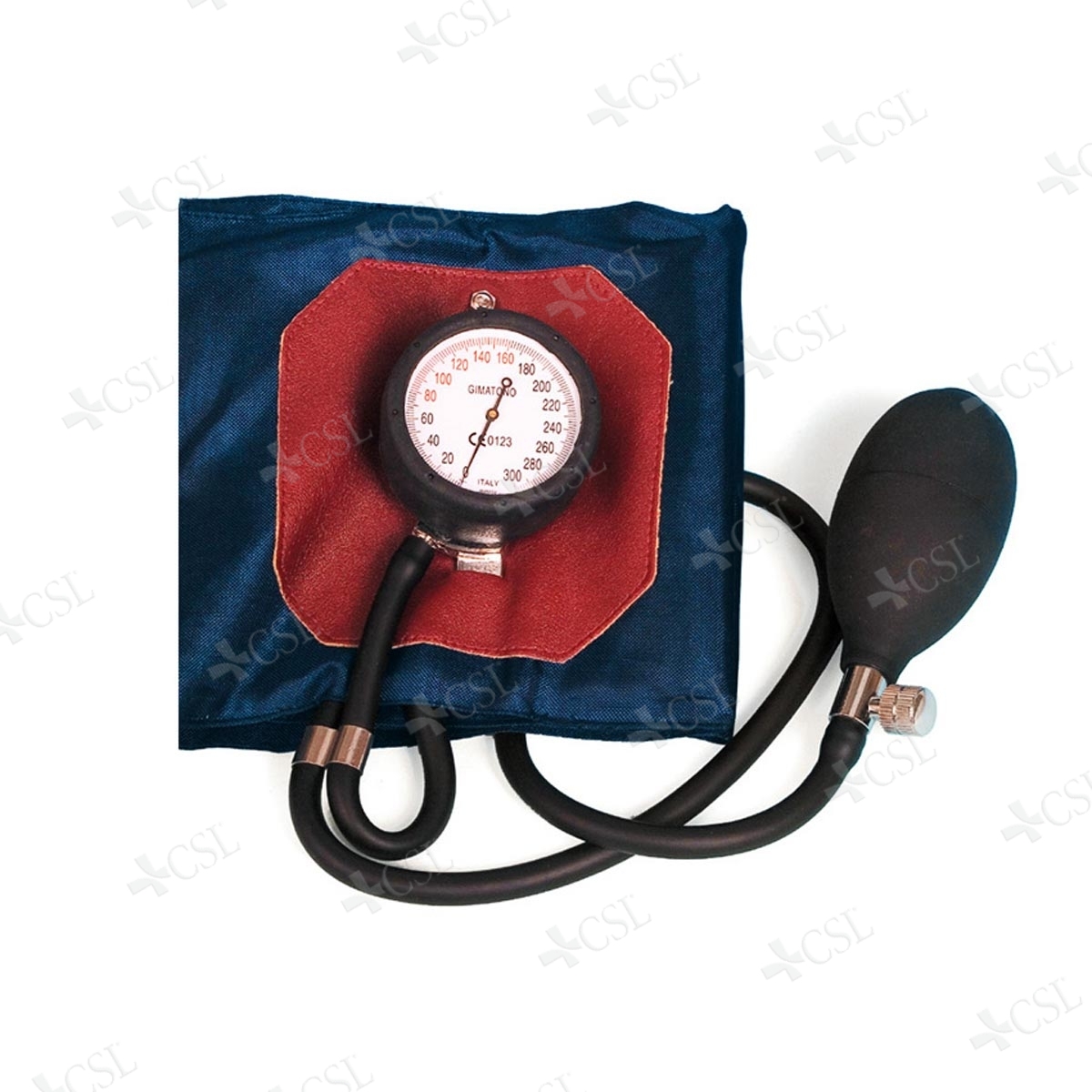 Sfigmanometro aneroide economico, manometro con anello di protezione fissato sul bracciale a velcro. Fornito con custodia.