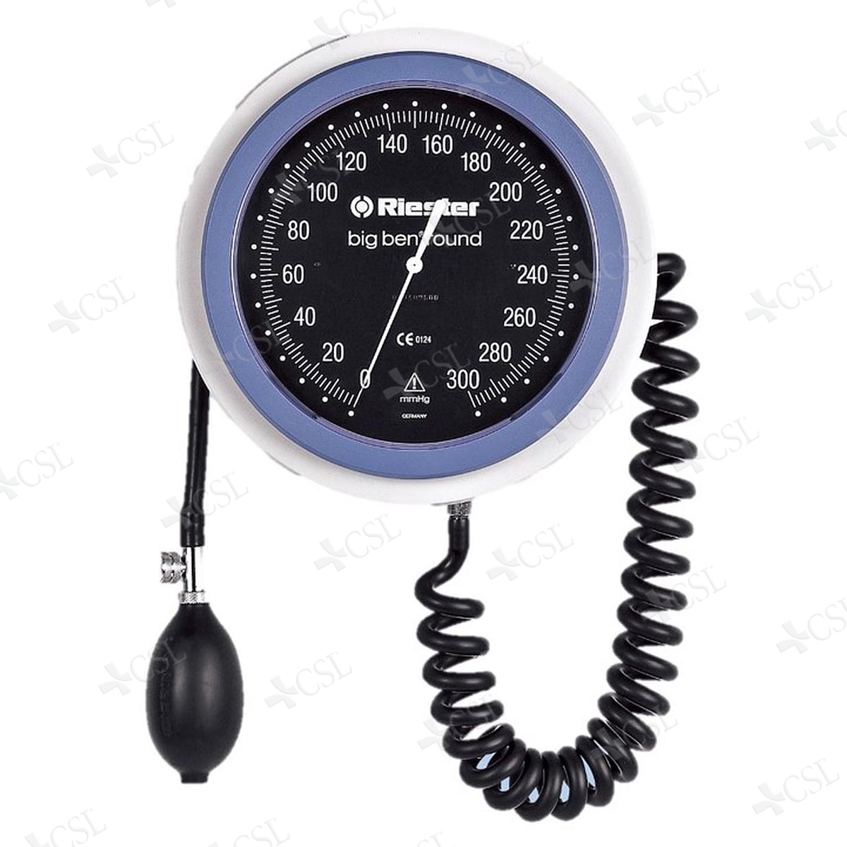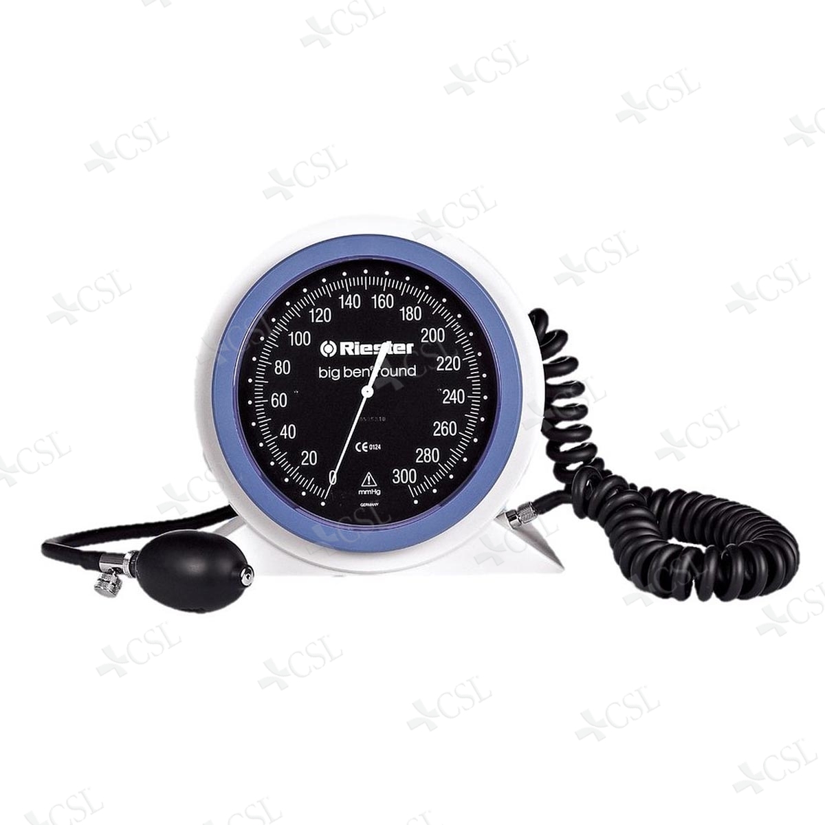 Sfigmomanometro professionale Riester da tavolo, ampio manometro diametro mm 147 e lancetta bianca su quadrante nero, misurazioni da 0 a 300 mmHg. Bracciale a velcro a due tubi e tubo a spirale estensibile fino a m 3.
