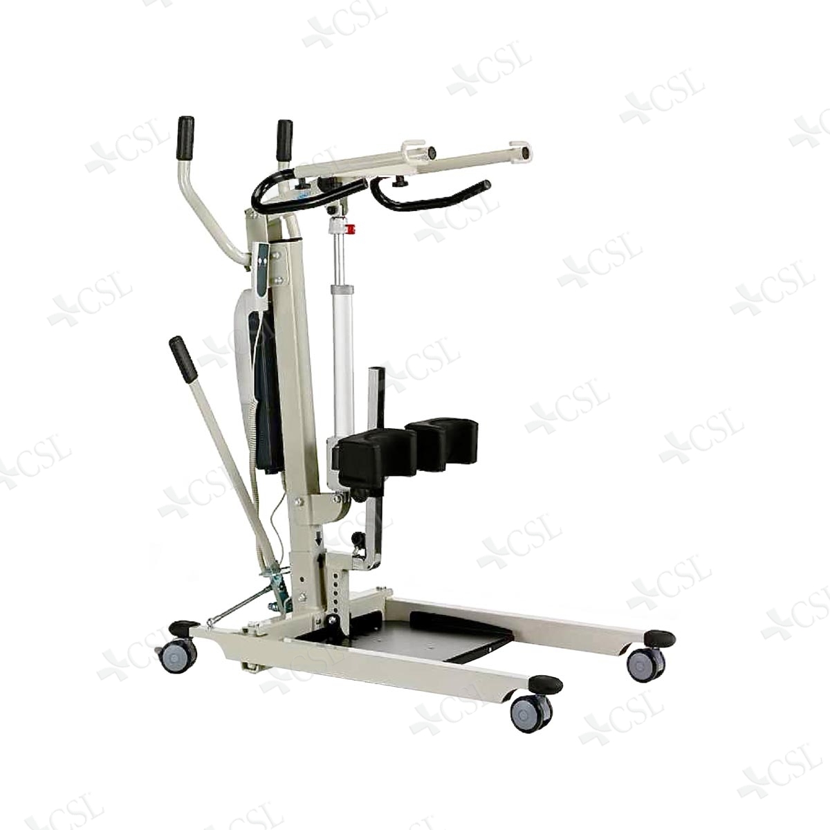 Struttura in profilato d’acciaio verniciato a polveri, sollevamento del paziente a mezzo attuatore elettrico da 24V, provvisto di blocco meccanico per la discesa rapida ammortizzata, la pulsantiera e´collegata alla centralina con cavo spiralato e spinotto a baionetta,con pulsanti di comando del tipo a “pressione costante”. Il sollevatore e´corredato da due pacchi di batterie ad alta capacita´, centralina con pulsante di emergenza e con blocco elettronico per carichi eccessivi, indicatore visivo e acustico della carica delle batterie e funzione di emergenza per l’abbassamento in caso di guasto.Il carica batterie esterno indica quando le batterie sono in fase di carica( led giallo) e quando sono cariche (led verde), la ricarica avviene in circa 4 ore. Possibilita di variare l’altezza della colonna su foro predisposto, braccio di sollevamento a misura variabile secondo l’altezza dell’utilizzatore; ginocchiere separate regolabili in larghezza e altezza, base con gambe apribili mediante leva posteriore. Pedane con impronta piedi indipendenti, regolabili in larghezza e asportabili, maniglione per la movimentazione e 4 ruote gemellate di cui le posteriori con freno. Escursione da cm 84 a cm 182. Portata Kg 200. Completo di imbragatura a corsetto.